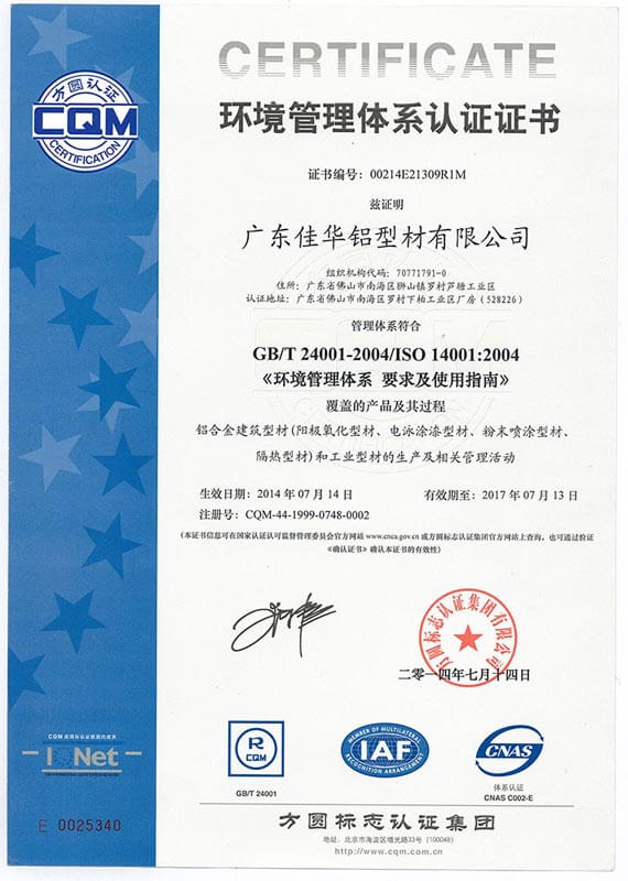 環(huán)境管理體系認證證書