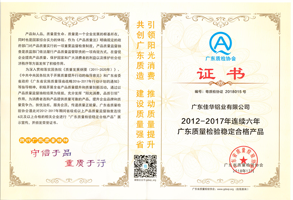 2018年12月,佳華鋁業(yè)再次榮獲“2012-2017年連續(xù)六年廣東質(zhì)量檢驗穩(wěn)定合格產(chǎn)品”證書,體現(xiàn)了行業(yè)對于佳華鋁業(yè)產(chǎn)品質(zhì)量的認(rèn)可。
