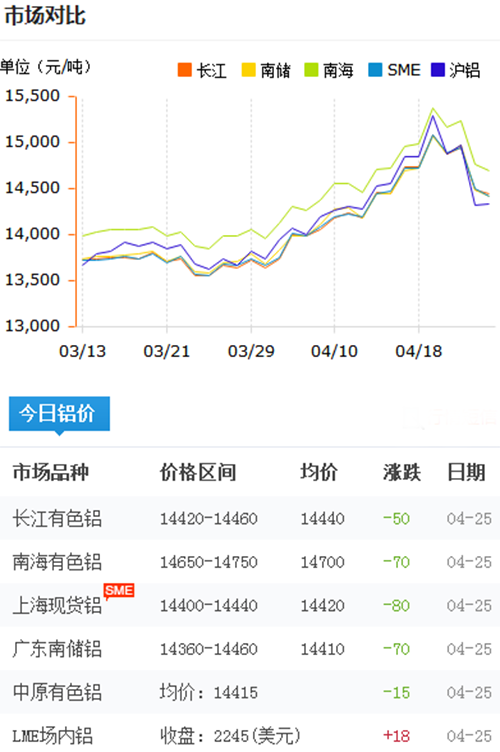 鋁錠價格今日鋁價2018-4-25
